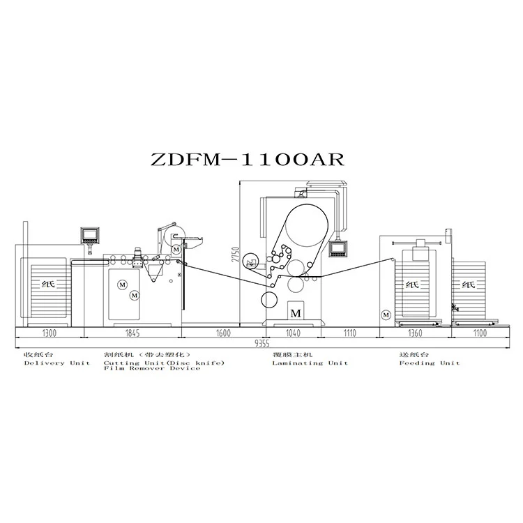 Ruimteplanning: De totale lengte van de Automatic Film Remover Lamineermachine bedraagt ongeveer 9,4 meter, en er moet extra opslag- en vervangingsruimte worden gereserveerd voor filmrecyclingrollen. Het wordt aanbevolen om minimaal 2 meter bedieningskanaal aan de kronkelzijde te reserveren.